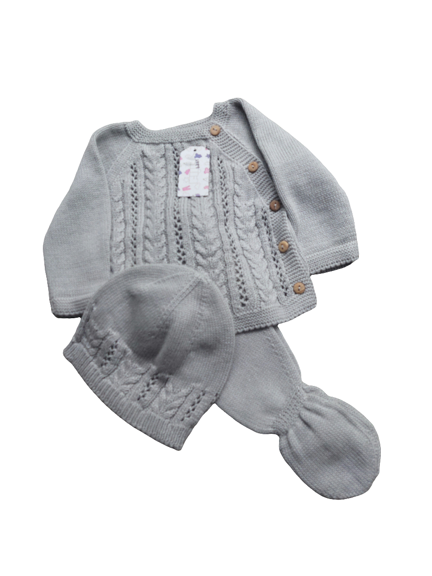 Driedelige set van biologisch katoen uit Portugal. Bestaand uit Truitje met mutsje en een broek met voetjes. In diverse kleuren en maten leverbaar.