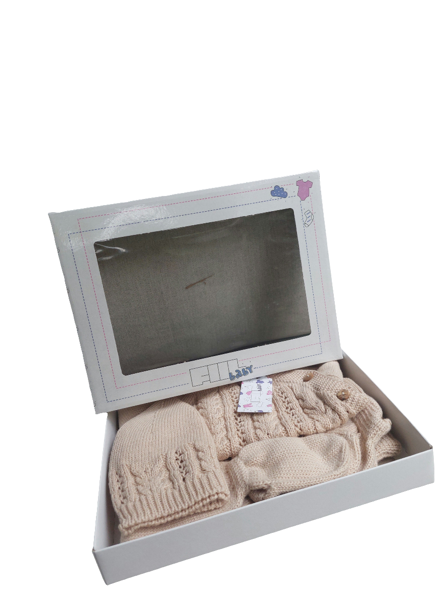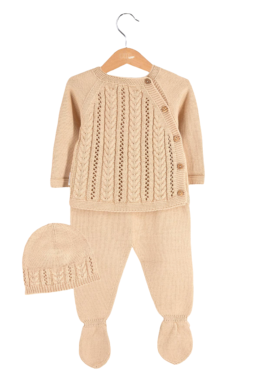 Set van 3 stuks in katoenen breiwerk Wheat. De set bestaat uit: - Trui met knoopsluiting aan de achterkant met houten knopen - Gebreide broek - Gebreide muts De collectie met de naam "tarwe" is geïnspireerd door de natuur, de basisbehoeften van de mensheid en een terugkeer naar de oorsprong. Het kenmerkt zich door het gebruik van duurzame en milieuvriendelijke materialen./Set of 3 pieces in cotton knit Wheat. The set consists of: - Sweater with button closure at the back with wooden buttons - Knitted trousers - Knitted hat The collection called "wheat" is inspired by nature, the basic needs of humanity and a return to origins. It is characterized by the use of sustainable and environmentally friendly materials./Conjunto de 3 piezas en punto de algodón Wheat. El conjunto incluye: - Suéter con cierre de botones de madera en la espalda - Pantalón de punto - Gorro de punto. La colección "Wheat" se inspira en la naturaleza, las necesidades básicas de la humanidad y el retorno a los orígenes. Se caracteriza por el uso de materiales sostenibles y respetuosos con el medio ambiente.