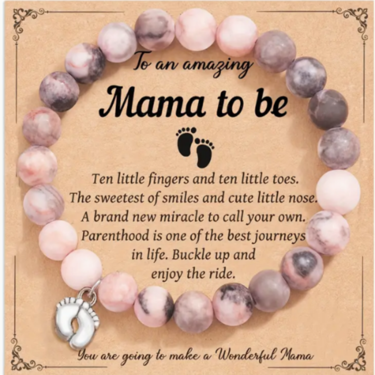 Preciosa pulsera rosa con piececitos de bebe y tarjeta con texto.