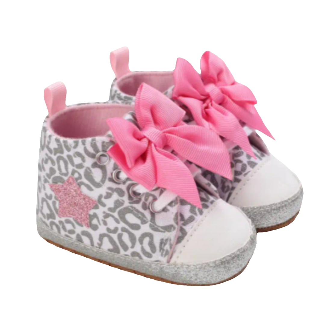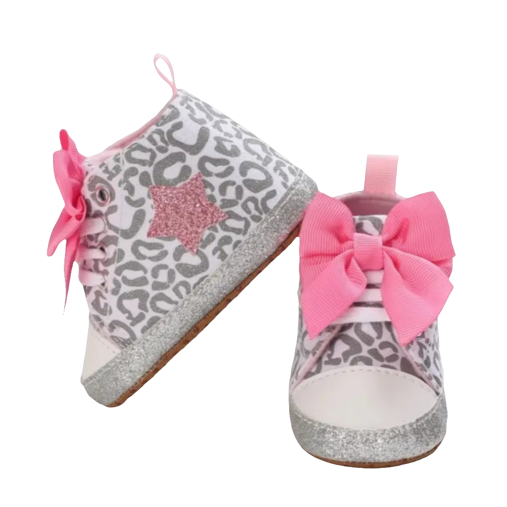 Dit hoog model gymp is voorzien van een leuke print en bij de enkel zit een roze ster. De zool is in glitterstof. Aan de voorzijde zitten grote strikken.