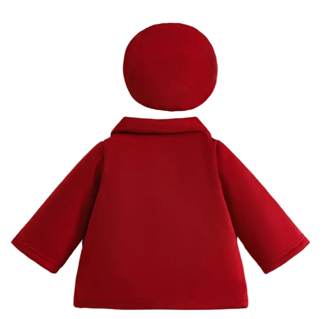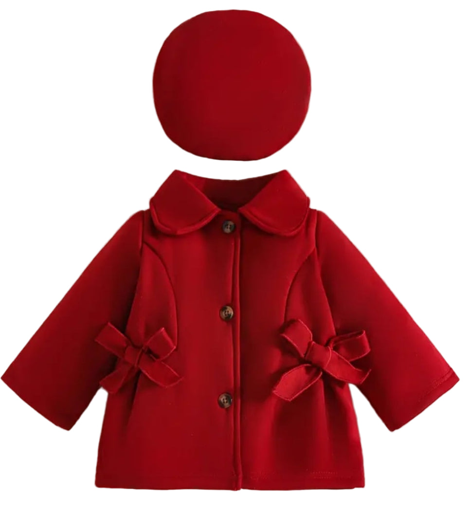 Jas met strikjes op het voorpand met bijpassend baret wijnrood