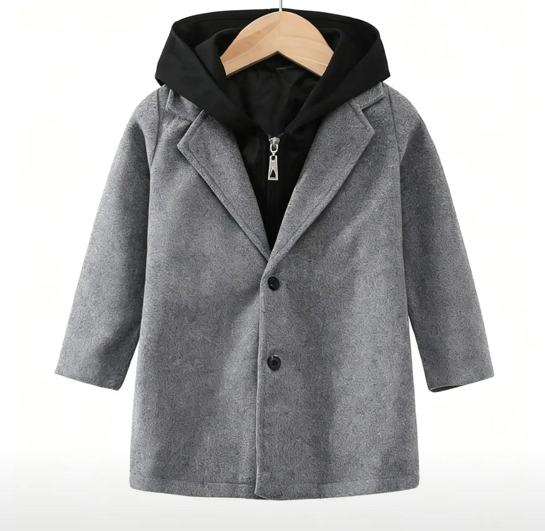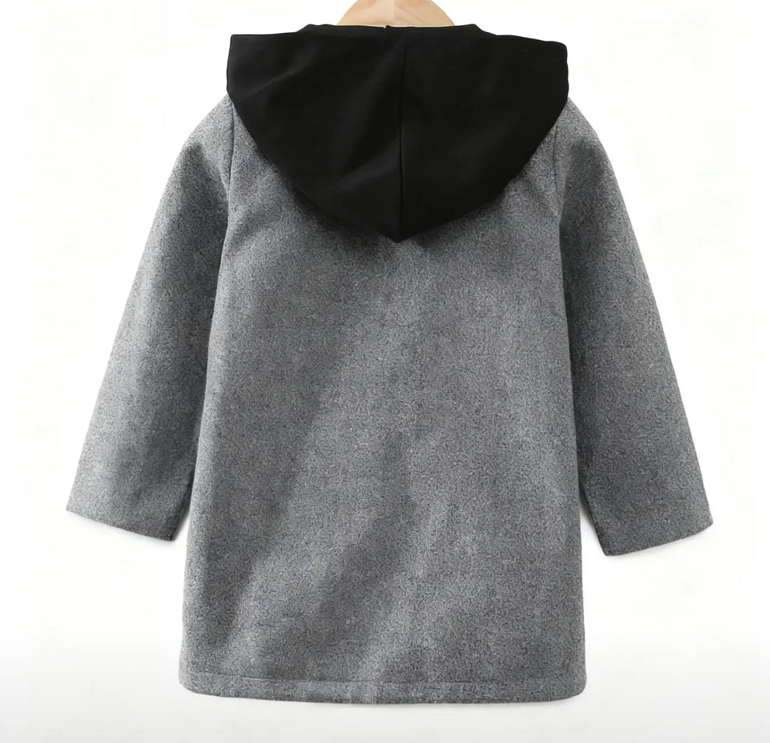 Grijze jas met zwarte capuchon die vast zit aan de jas.