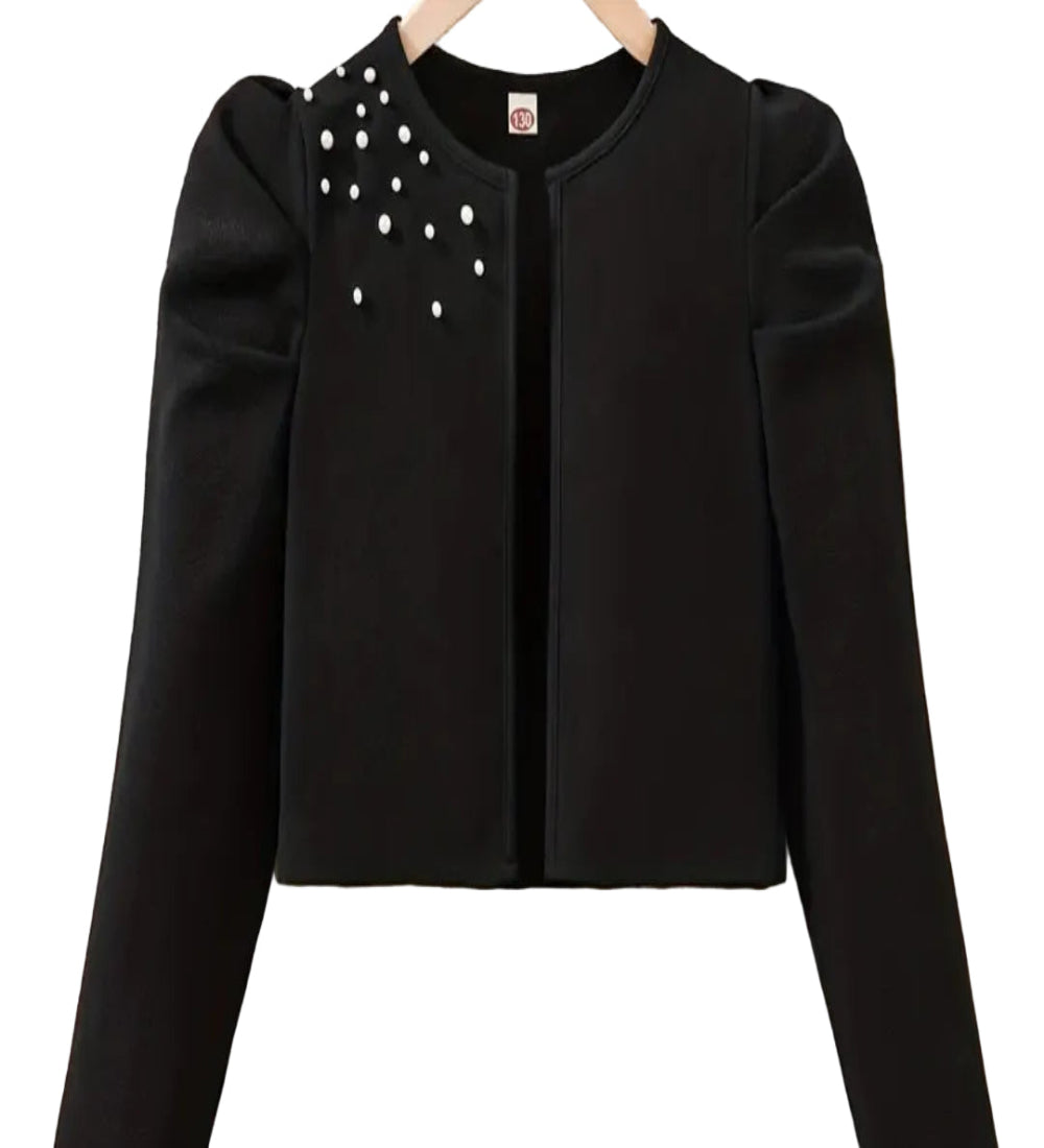 Mooi kort jasje voor over een avondjurkje. Zwart met pareltjes