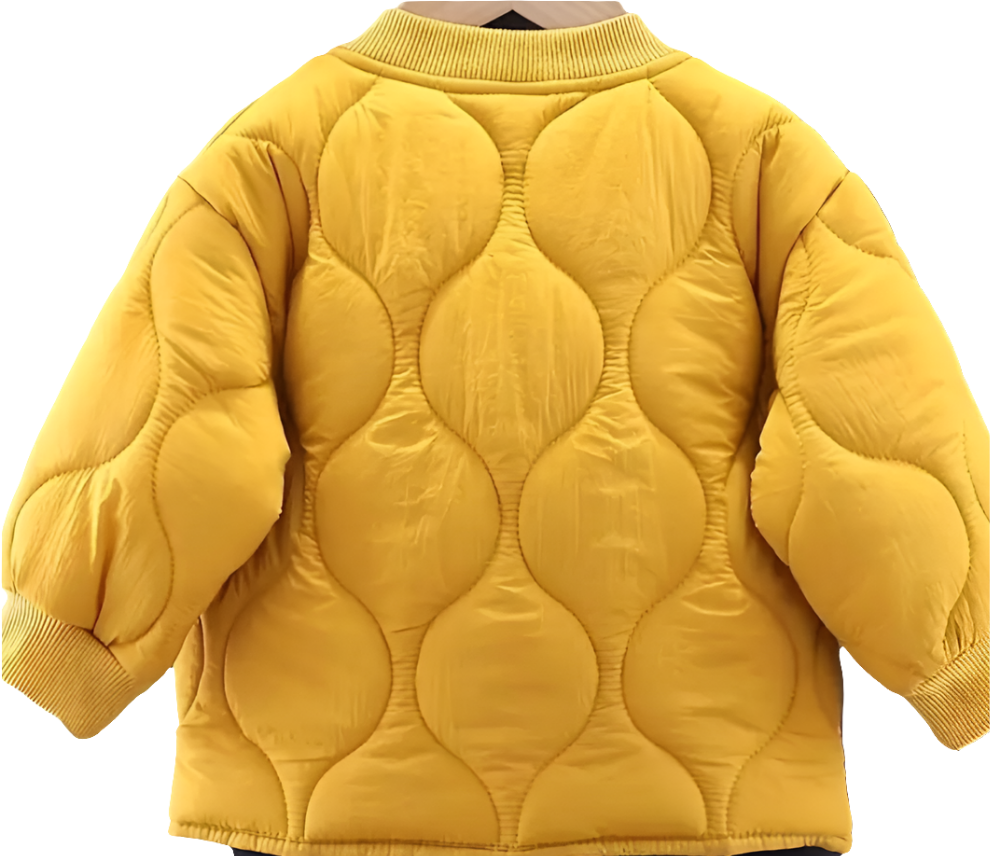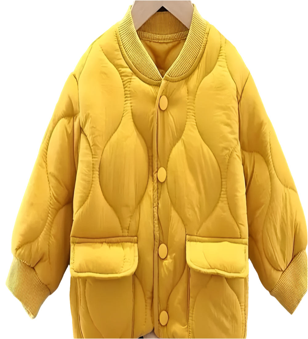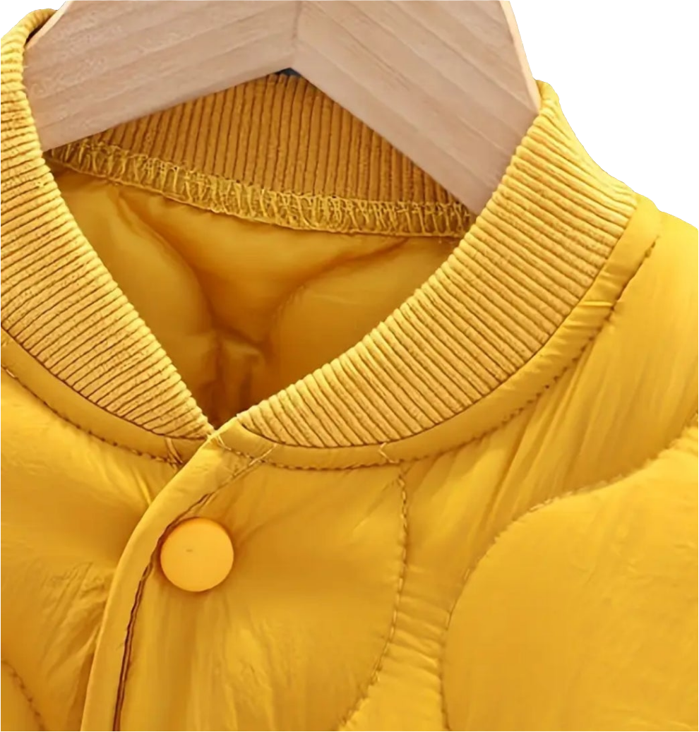 Goudgeel doorgestikt jack met drukknopen en twee voorzakken. Heel geschikt voor de Herfst. / Golden yellow quilted jacket with press studs and two front pockets. Very suitable for autumn. / Chaqueta acolchada amarillo dorado con botones a presión y dos bolsillos delanteros. Ideal para otoño.
