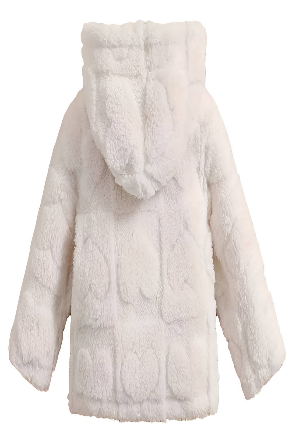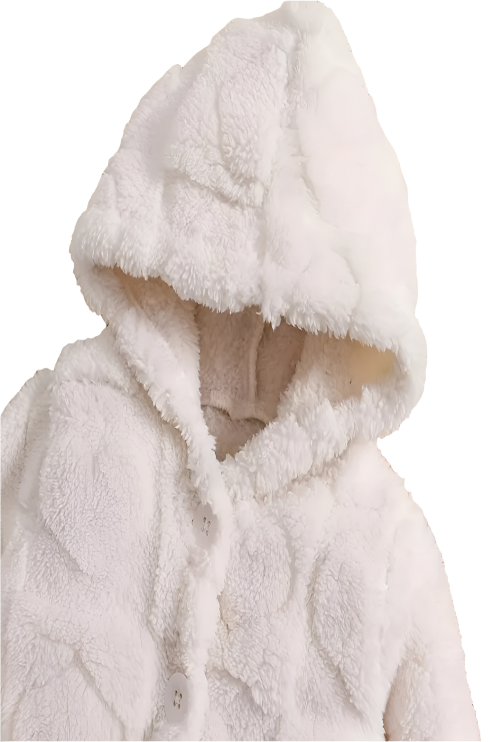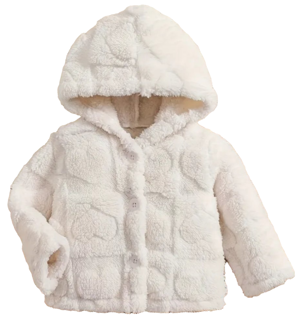 Roomwit fleece jas met capuchon. De jas sluit met knopen en heeft een hartjespatroon./ Cream-white fleece jacket with hood. The jacket closes with buttons and has a heart pattern./Chaqueta polar color crema con capucha. Se cierra con botones y luce un estampado de corazones.