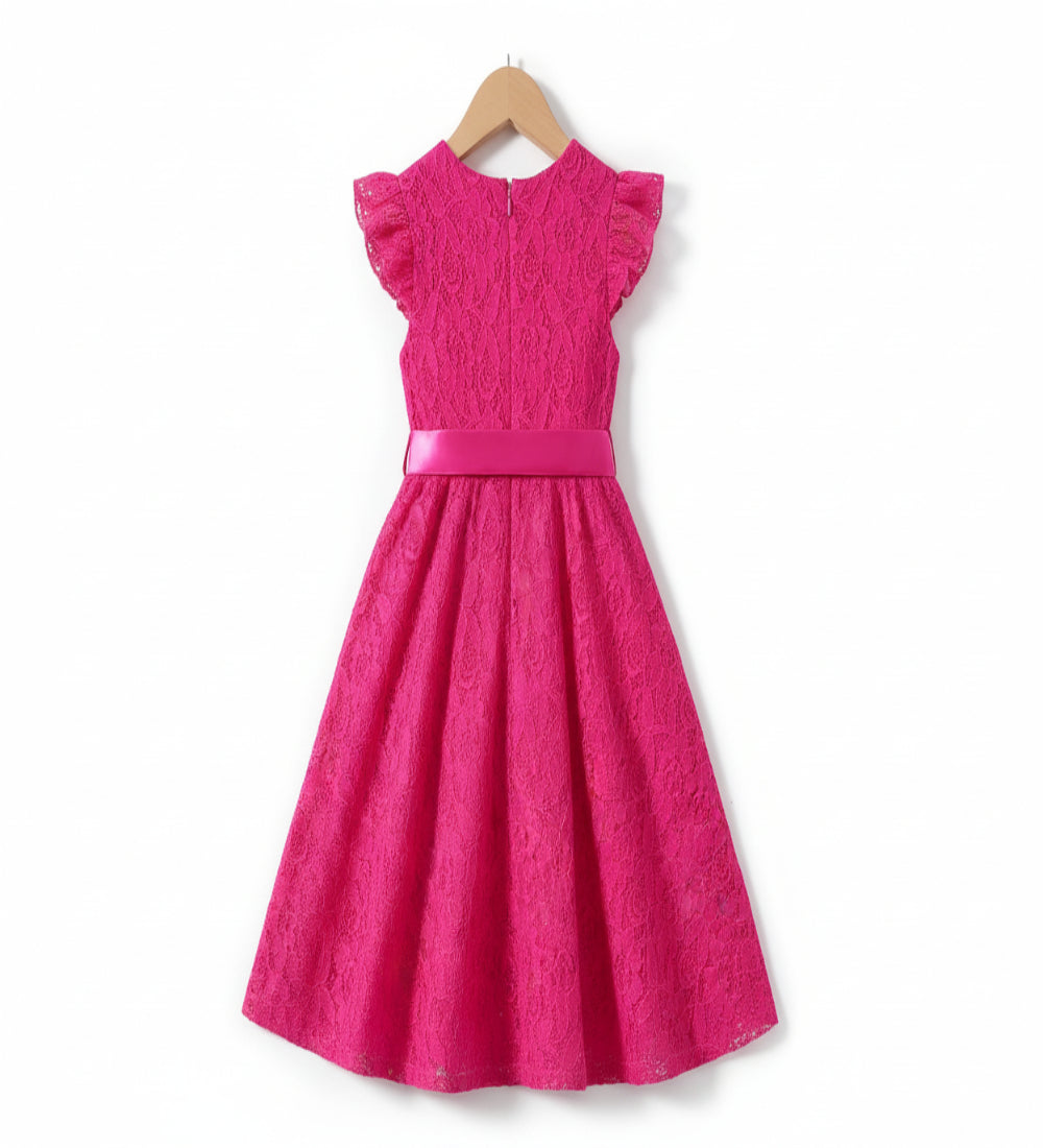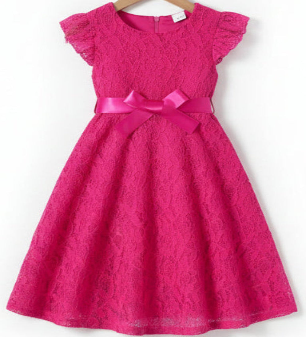 Feestjurkje van kant met satijnen riempje. In diverse kleuren leverbaar