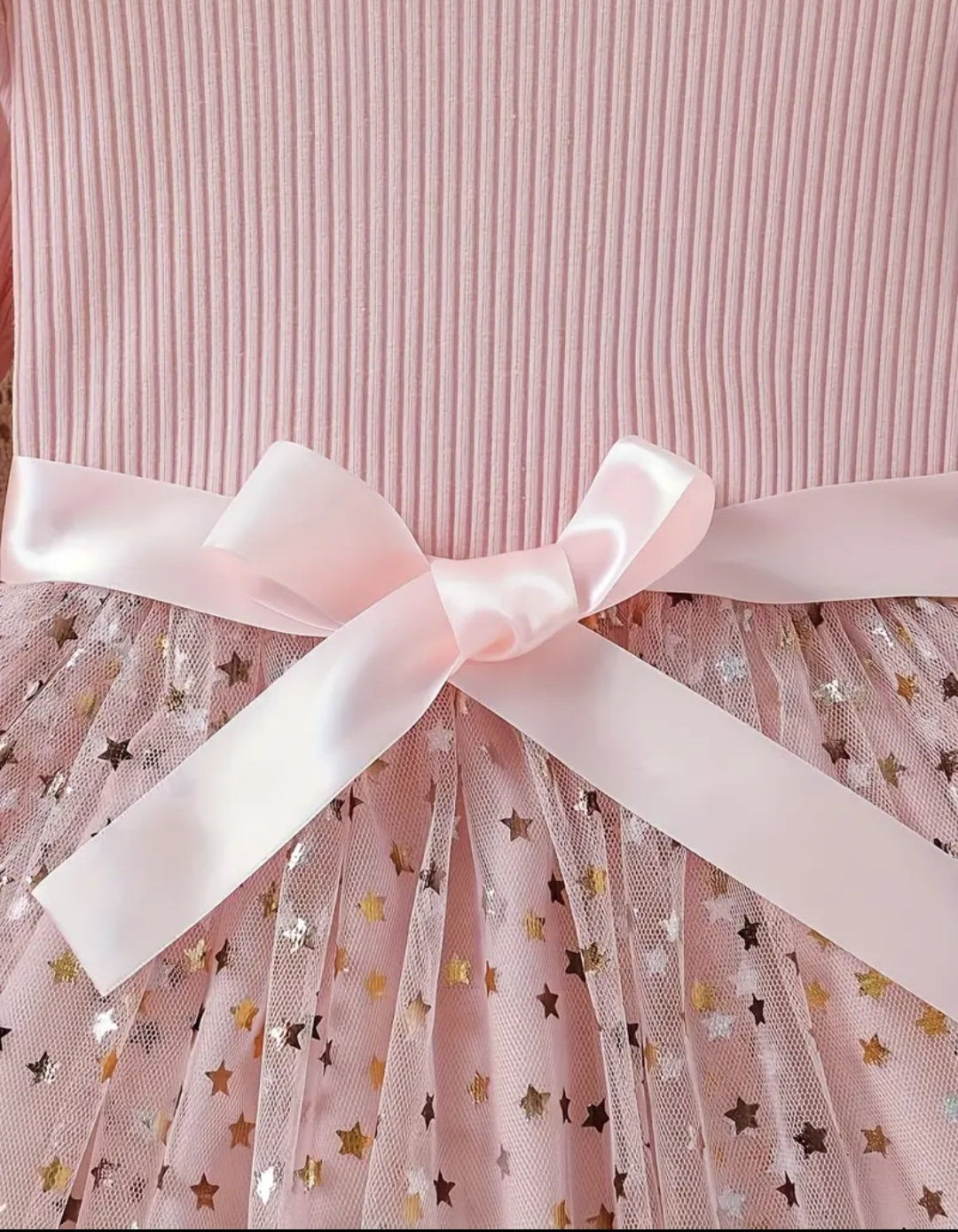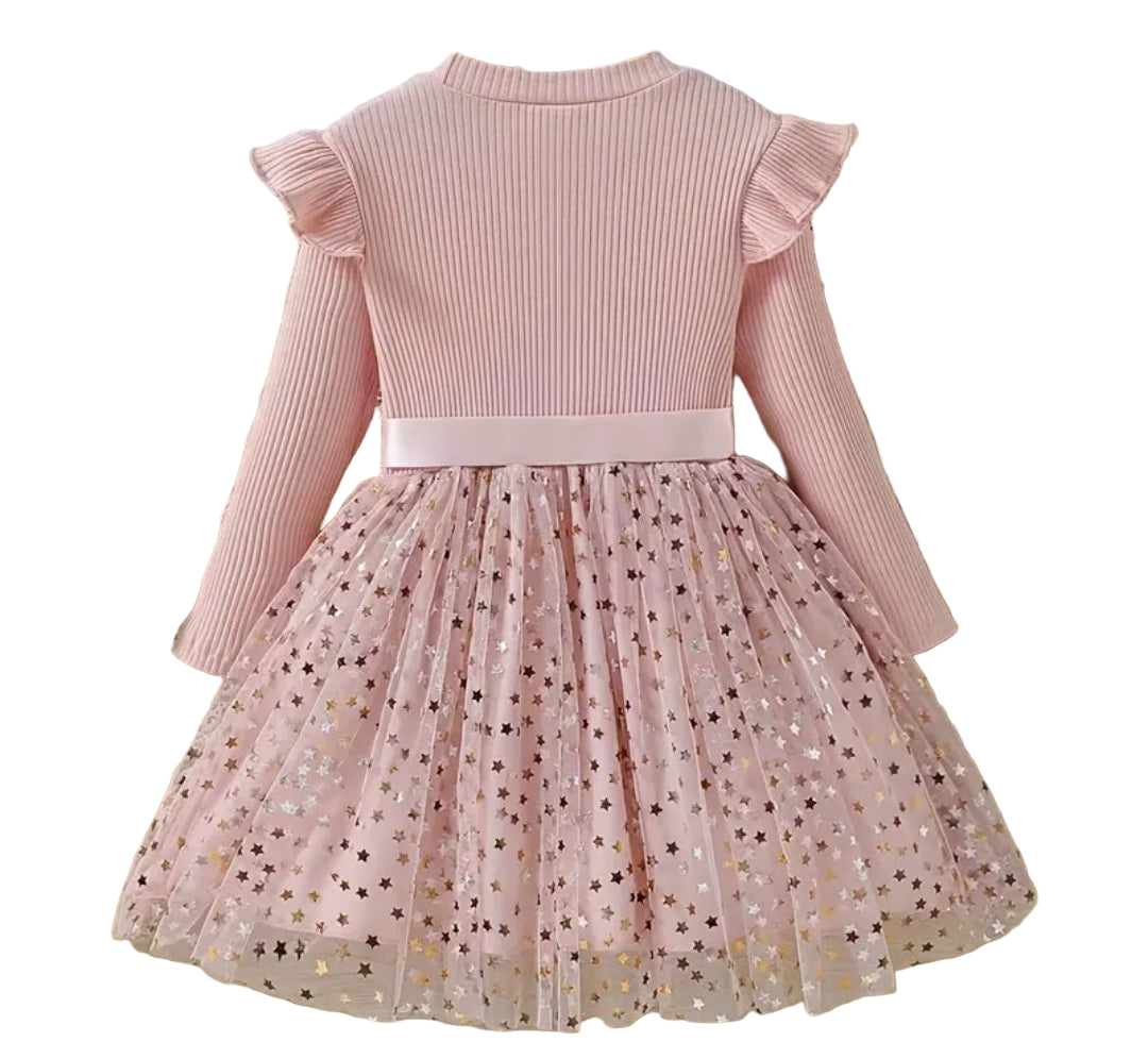 jurk voor Kerst. Bovenzijde van tricot en onderzijde van tule met gouden spikkels. In roze ,zwart en wijnrood verkrijgbaar.
