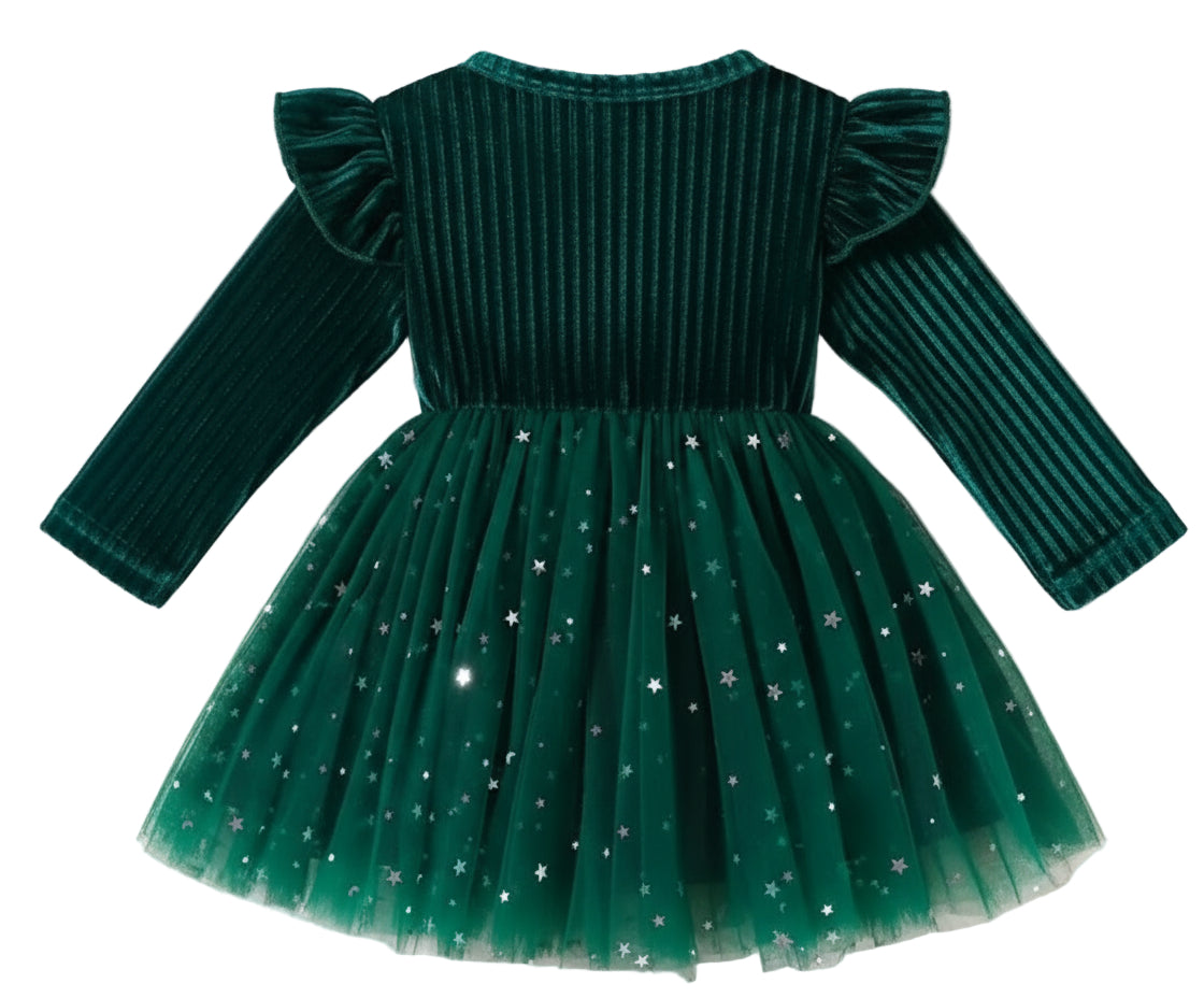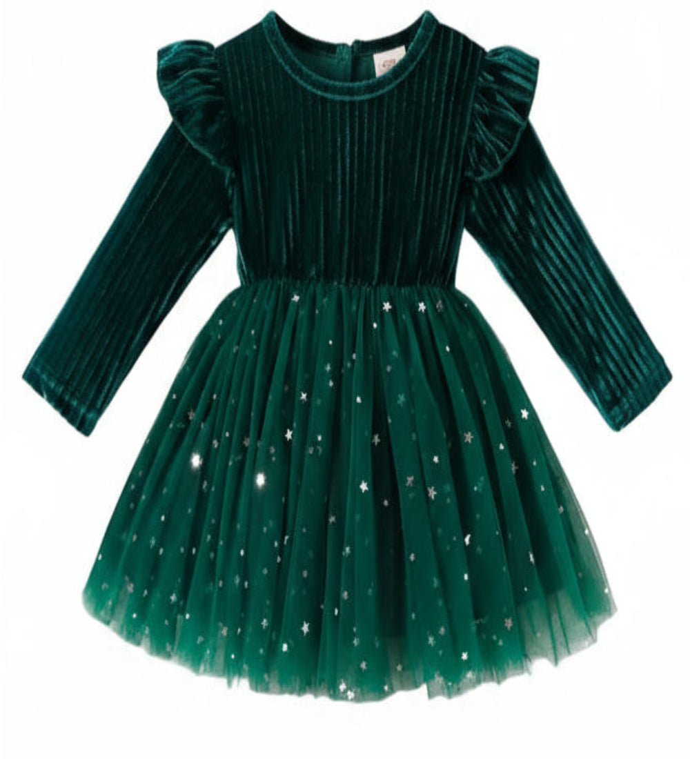 kerstjurk groen bovenlijf met tule rok met zilveren spikkels.Ook in rood leverbaar
