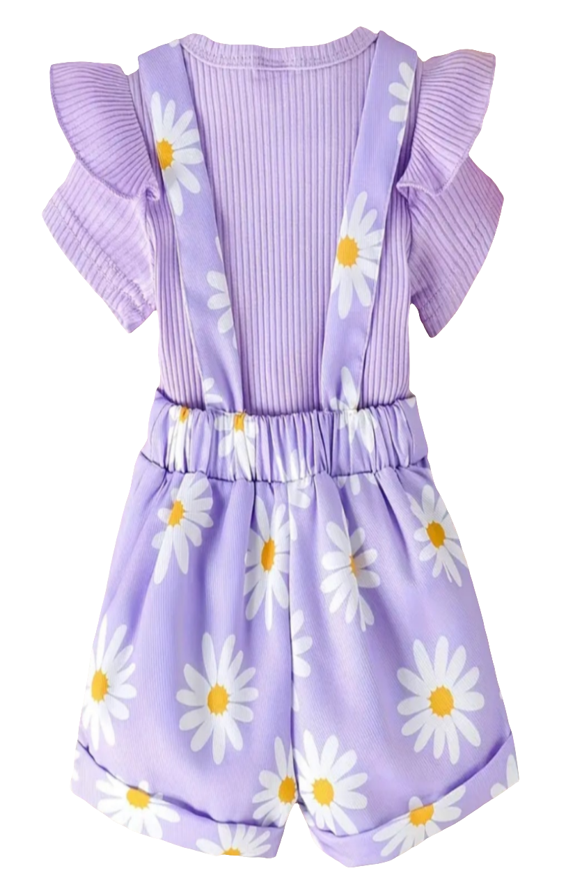 Tuinpak kort lila met madeliefjes en eeen katoenen body.Te combineren met de witte gympjes.