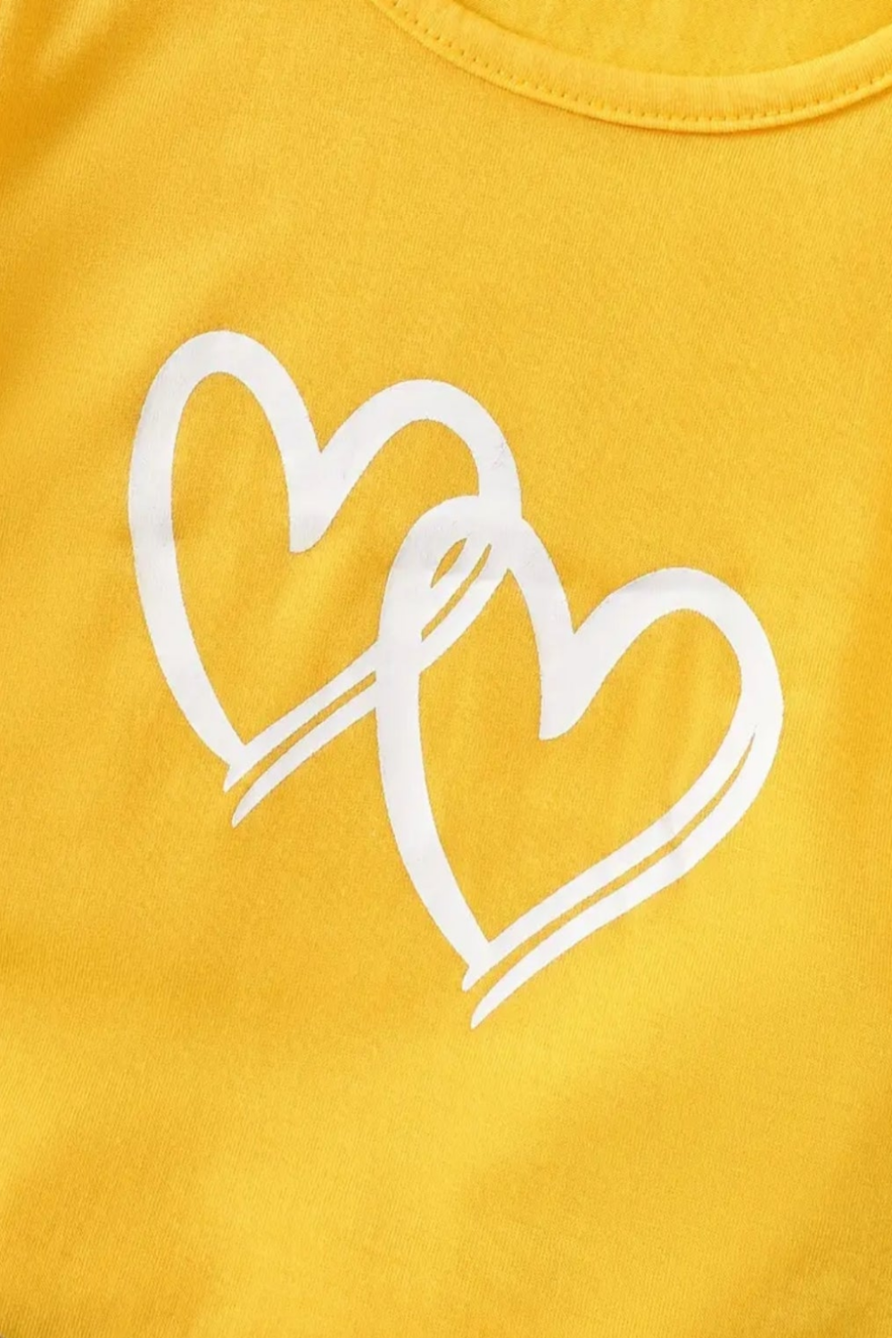 Set: Shirt geel met hartjes en jeansshort met bloem. Leuk te combineren met de gele gympjes.