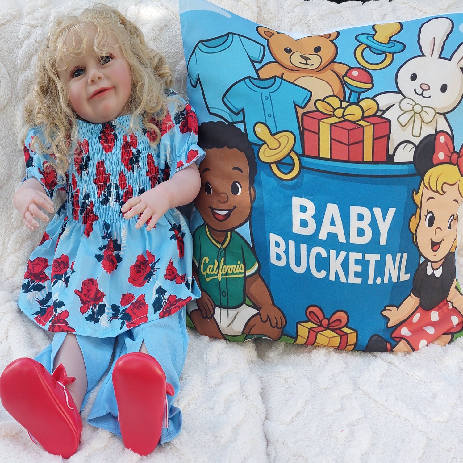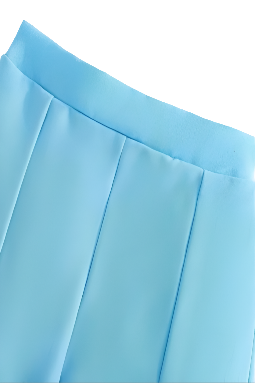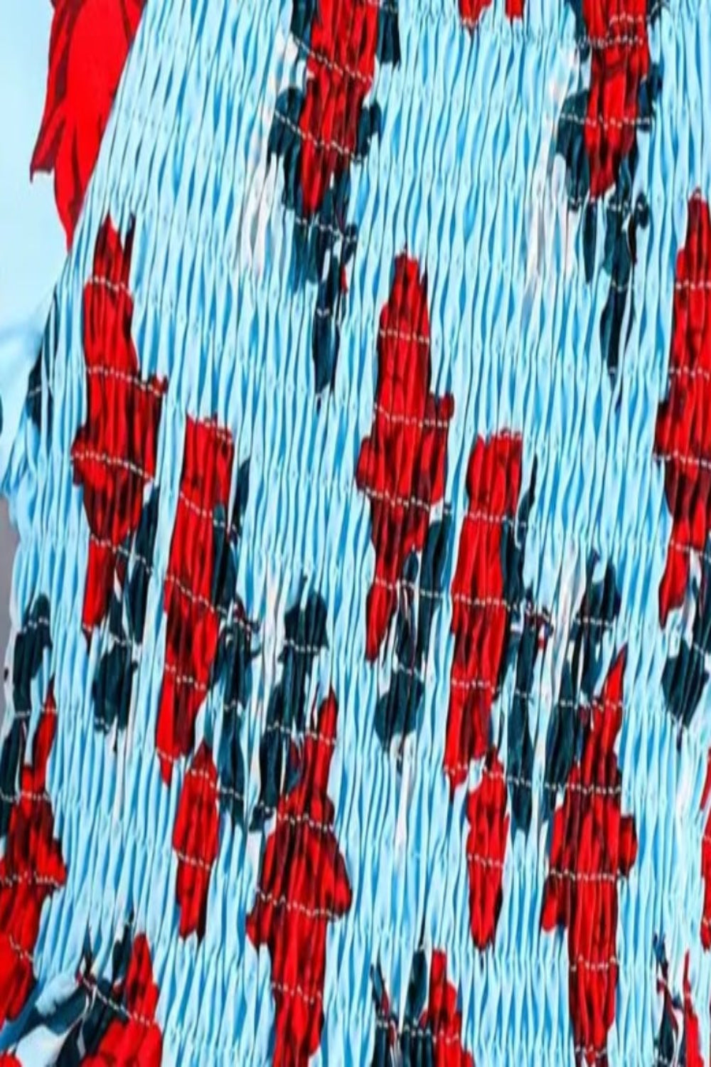 Top lichtblauw met rode bloemen en lichtblauwe broek met split aan onderzijde pijp (te combineren met de rode schoentjes))